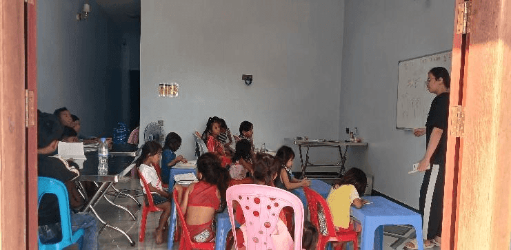 사역자는 캄보디아 장로교신학교 출신으로, 남자 선생님 지디(어른반)·여자 선생님 시야(어린이반)가 맡았습니다. 첫날 어른반에 할머니 3명·아주머니 1명, 어린이반에 18명이 참석했습니다. 어린이 책상 6세트와 어른 책상 2세트를 후원으로 준비했는데 예상을 훨씬 넘는 참석자에 깜짝 놀랐습니다.